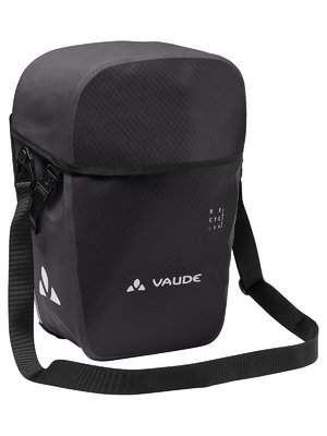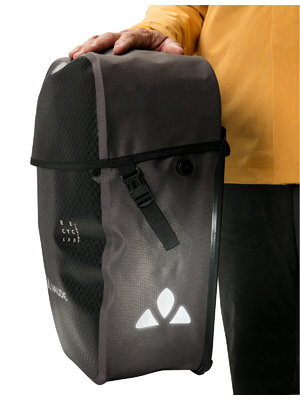 Die Fahrradtasche für klimafreundliche Radfahrer: Die Aqua Back Pro Single wird aus robustem, PVC-freiem Planenmaterial am deutschen VAUDE-Standort in Tettnang hergestellt und ist ein langlebiger Begleiter für viele Radtouren. Die Tasche ist mit reflektierenden Elementen bedruckt, absolut wasserdicht und kann durch den Deckelverschluss schnell geöffnet und wieder verschlossen werden. Eine zusätzliche Innentasche sorgt für mehr Übersichtlichkeit und 24 Liter Volumen für ausreichend Stauraum. Die umweltfreundliche Rückenplatte besteht vollständig aus recyceltem Material: Hierbei wird aus den gesammelten Kunststoffverpackungen deutscher Haushalte in einem innovativen Recyclingverfahren neuer, langlebiger Rohstoff erzeugt. Die dadurch äußerst stabile Rückenplatte wurde mit dem leicht bedienbaren QMR 2.0-System ausgestattet, damit die Tasche mit einem Handgriff an- und abgemacht und zudem wahlweise rechts oder links am hinteren Gepäckträger befestigt werden kann. Die Befestigung ist über einfach bedienbare Handrädchen justierbar und passt somit auf jeden Gepäckträger. Mit dem abschließbaren QMR 2.0 Befestigungssystem (z. B. TSA Schloss, nicht im Lieferumfang enthalten) lässt sich die Tasche sicher am Fahrrad verriegeln. Das VAUDE Green Shape-Label steht für ein umweltfreundliches, funktionelles Produkt aus nachhaltigen Materialien. Lieferumfang: 1 Tasche