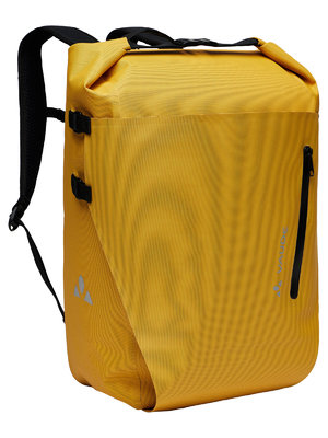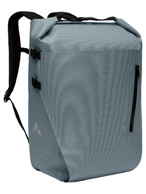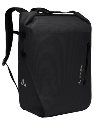 Innovative, 100 Prozent wasserdichte 2in1 Rucksack-Fahrradtasche Made in Germany in geradlinigem, zeitlosen Design fürs Pendeln oder Touren. Der mit 26 Litern sehr geräumige Rolltop Rucksack kommt mit gepolstertem Rücken, ergonomischen Schulterträgern und Brustgurt und lässt sich im Handumdrehen in eine Fahrrad Gepäckträgertasche verwandeln. Die Schulterträger werden in einer Netztasche am Rucksackrücken verstaut und mit der umlegbaren Frontabdeckung gesichert. Diese verfügt über eine Einschubtasche mit wasserdichtem Reißverschluss und ist zum Säubern komplett abnehmbar. Dank des bewährten QMR 2.0 Befestigungssystems wird die 2in1 Rucksack-Fahrradtasche sicher am Gepäckträger (mit runden Rohren von 8 bis max. 16 mm) angebracht und lässt sich auf Zug am Band, das die zwei Haken verbindet, rasch wieder lösen. Die QMR-Haken sind mit einem kleinen Bügelschloss (z. B. TSA-Schloss, nicht im Lieferumfang enthalten) abschließbar. Die Rucksack-Radtaschen-Kombination bietet viel Stauraum mit einem durchdachten Innenleben: ein polstertes Laptopfach für Geräte bis 13,3"" mit außen liegenden zusätzlichen Einsteckfächern für Smartphone, Stifte & Co. Je nach Beladung kann die 2in1 Rucksack Fahrradtasche in 3 Stufen seitlich komprimiert werden. Das robuste Taschen-Material in textiler Optik wird in der VAUDE Manufaktur wasserdicht verschweißt und ist komplett PVC-frei. Mit reflektierenden Logos.